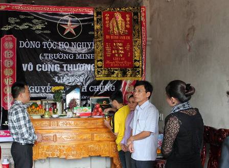 Mặt trời đứng bóng, đoàn chúng tôi đến thăm hỏi gia đình anh Chủng, không khí ảm đạm như bao trùm cả ngôi nhà. Trước bàn thờ đặt giữa nhà mọi người không khỏi xót xa mỗi khi nhìn vào mắt người vợ trẻ đang đứng nép mình bên góc. Chị chẳng nói câu gì, thất thần, rơm rớm lệ. Anh sinh ra và lớn lên trên mảnh đất nghèo chứa chan tình làng nghĩa xóm. Anh ra đi vợ con mất một người chồng, người cha thân thương trách nhiệm, gia đình mất một người "máu mủ ruột già", cả làng quê mất một người láng giềng hiền lành tốt bụng.
